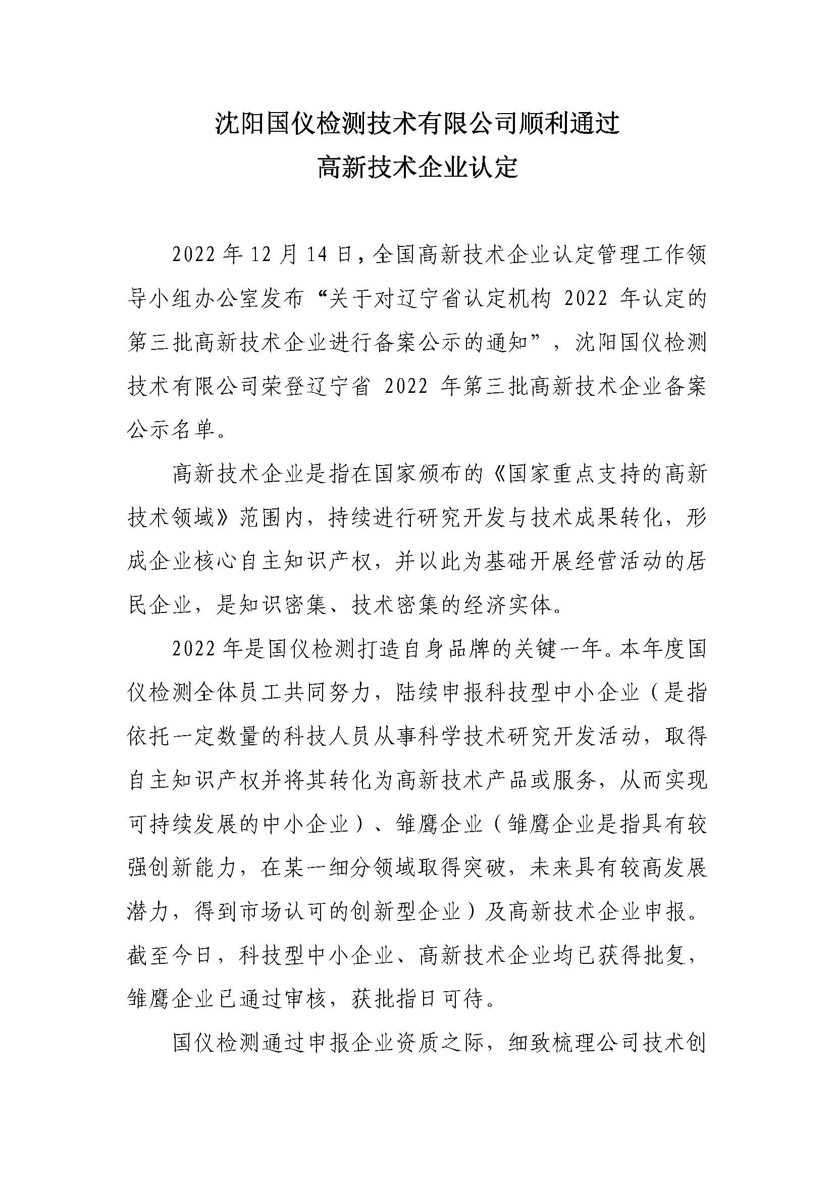 沈陽國儀檢測技術(shù)有限公司順利通過高新技術(shù)企業(yè)認(rèn)定